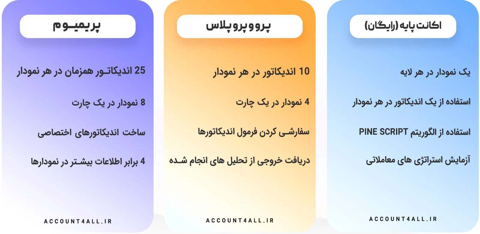 این قابلیتها در قالب اکانت پرمیوم Trading view، پرو، پرو پلاس و یک اکانت محدود رایگان، هر یک با مزایای مختص به خود، قابل دسترسی خواهند بود.